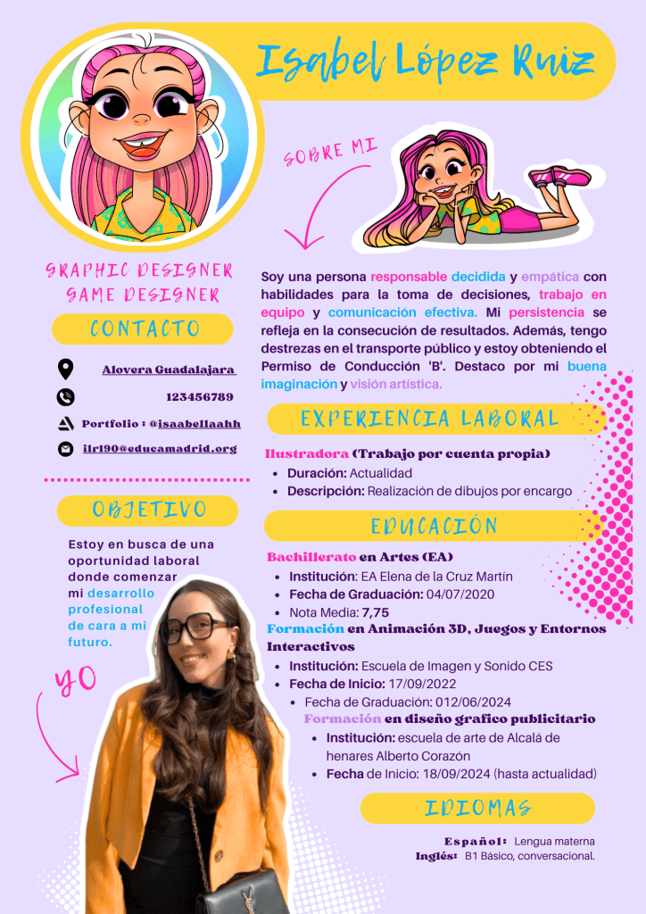 Te recomiendo que leas mi currículum y veas un poco de mi trabajo. Actualmente estoy terminando mi curso de Diseño Gráfico, pero ya tengo varios proyectos de los que estoy muy orgullosa, y muchos otros que sigo perfeccionando. Si quieres trabajar conmigo o darme una oportunidad, estoy completamente abierta a empezar con un periodo de prácticas y aprender junto a tu equipo. ¡Estoy lista para crear, crecer y aportar con entusiasmo!